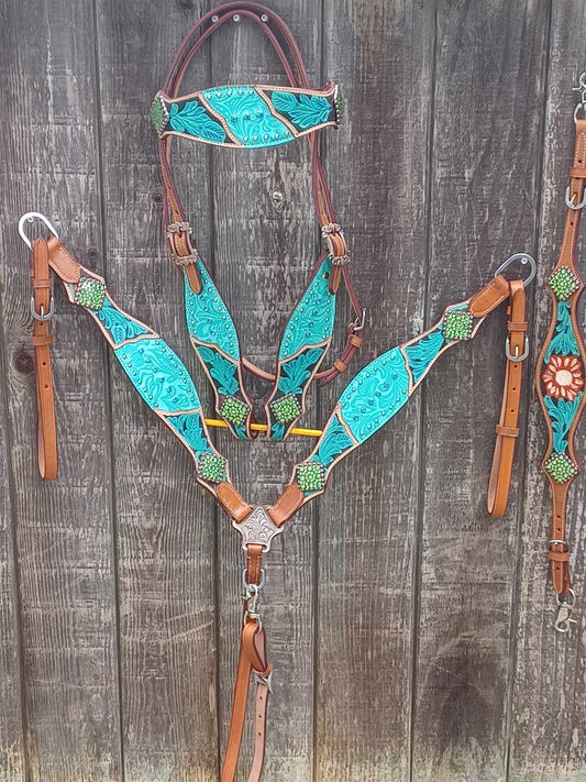 Tropical Turquoise Floral Filigree Tooled and Painted Horse Tack Bridle Set