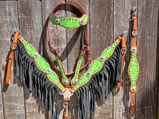 Lime Green Tropical Flower Fringe Horse Tack Bridle Set with Wither Strap