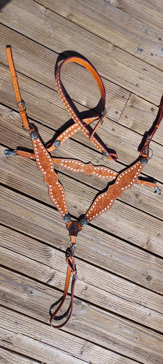 Sunflower Tooled Buck-Stitch Horse Tack bridle Set with Wither Strap