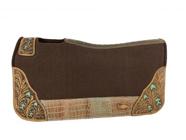 28x30 Barrel Style 1” Brown felt pad with painted arrow design. This beautiful pad features a distressed brown leather with hand painted turquoise arrow design. This saddle pad features a 1" heavy duty brown felt with vented wither and leather reinforced spine.