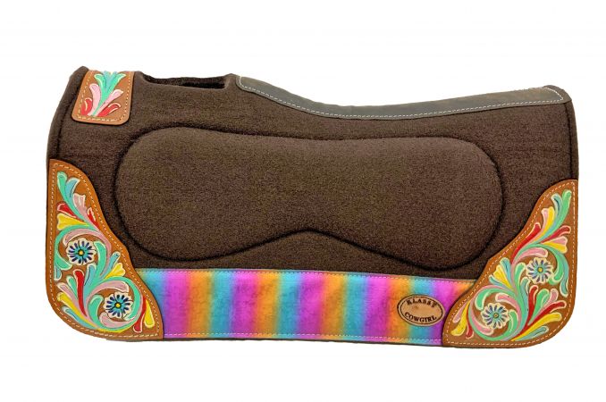28x30 Barrel Style 1” brown felt pad with painted floral design. This beautiful pad features a distressed brown leather with rainbow accent, and painted floral design. This saddle pad features a 1" heavy duty brown felt with vented wither and leather reinforced spine.