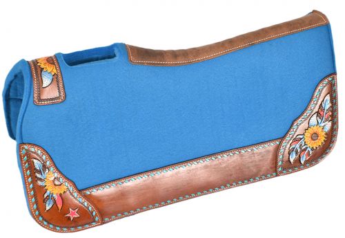 31" x 32" x 1" Turquoise felt saddle pad with hand painted sunflower, feather, and star design. This pad features 1" thick, heavy duty turquoise felt with vented wither, leather reinforced spine and oversized wear leathers. Wear leathers are accented with hand painted sunflower, feather, and star design.