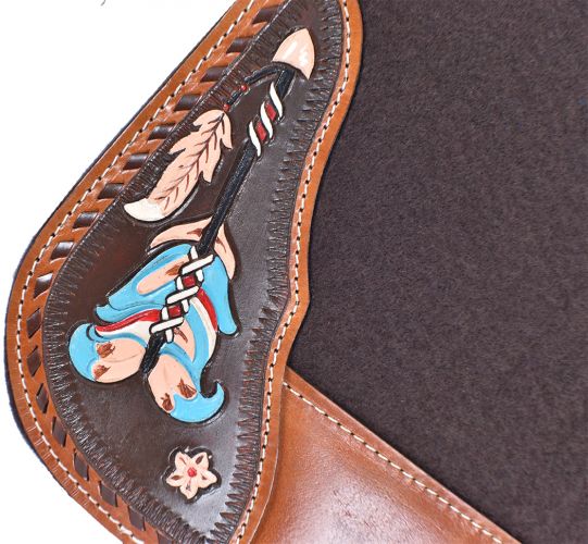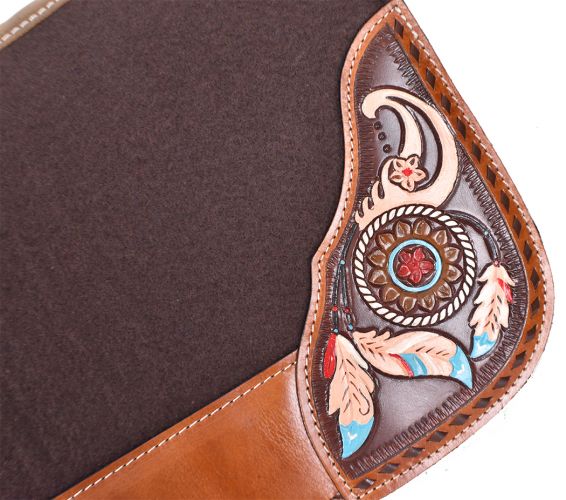 32" X 31" Contoured felt bottom saddle pad with painted wear leathers. This pad features 1" thick brown felt with vented wither and reinforced leather spine. Oversized wear leathers features hand painted dreamcatcher design and buck-stitch trim.