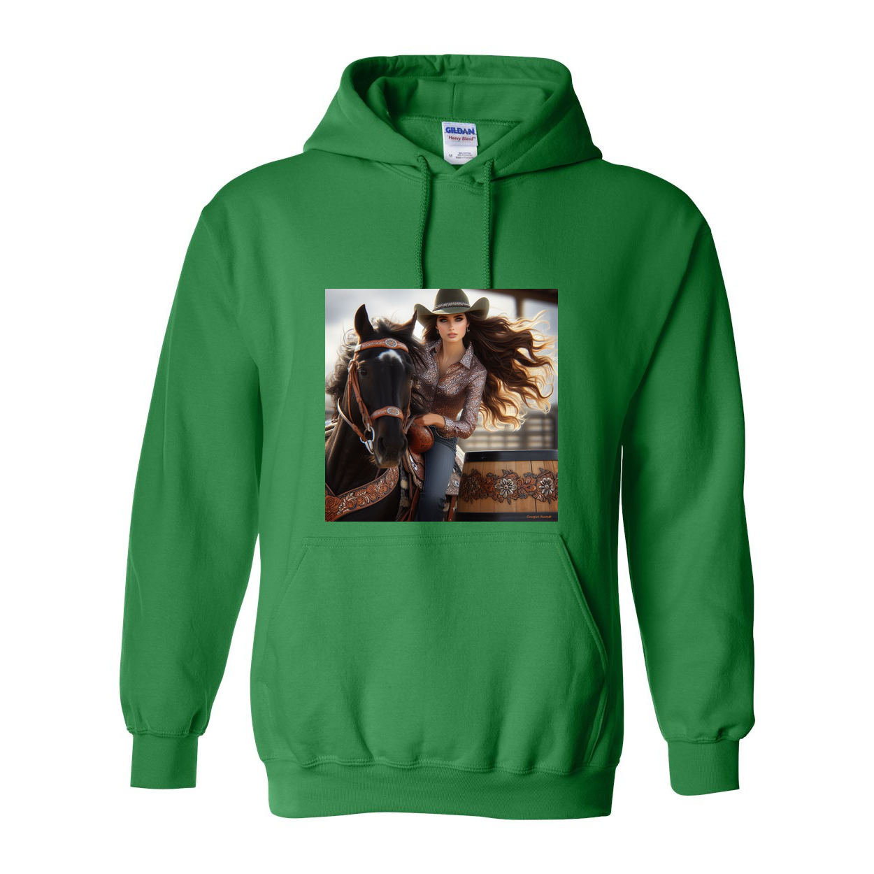 Beautiful Barrel Racer sits in a Full Turn N Burn on One Our Amazingly Comfortable Hoodies