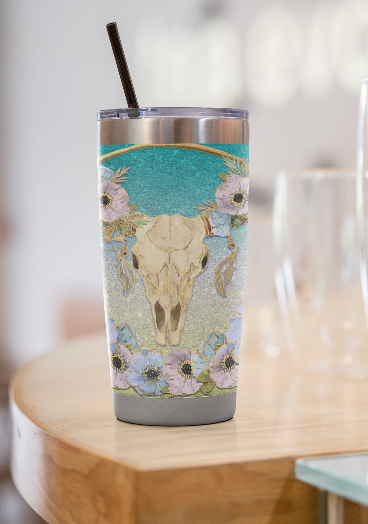 Cowgirl Roots™ Tumbler 20oz Bohemian Longhorn, Stainless Steel Insulated Hot and Cold Mug