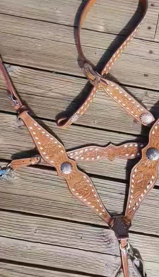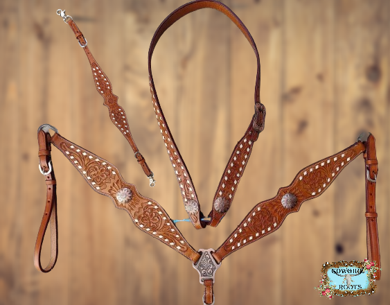 Flower Tooled White Buck-Stitch Horse Tack Bridle Set with Wither Strap