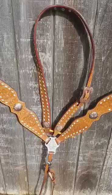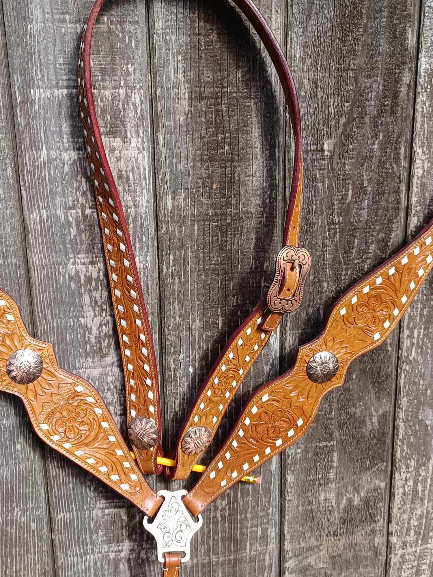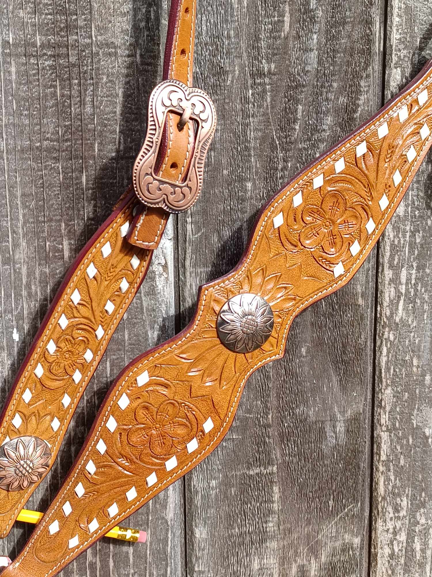 Incredibly Tooled Tropical Style Western Flower White Buck-Stitch Belt Buckle Style Headstall with Wither Strap