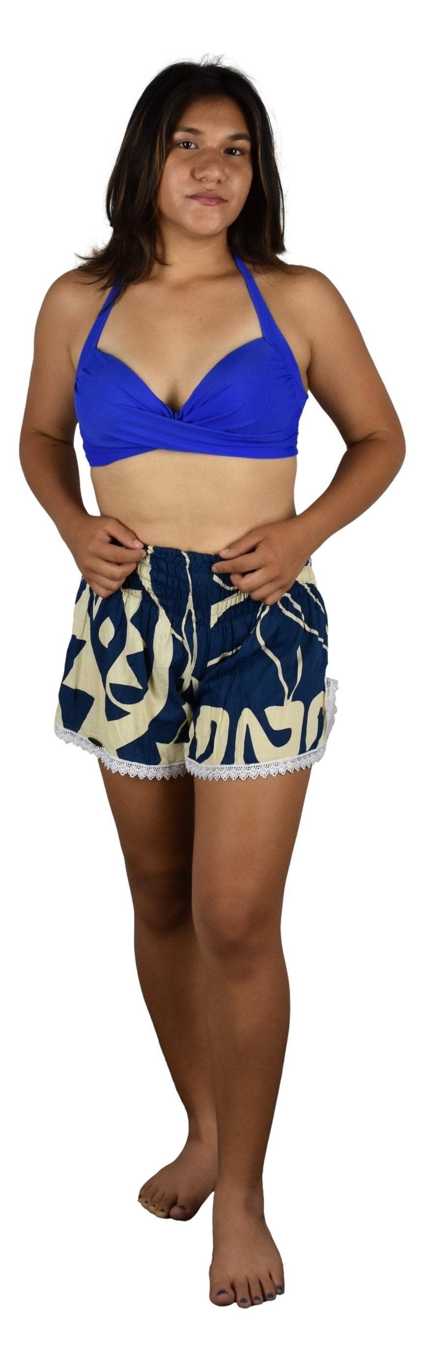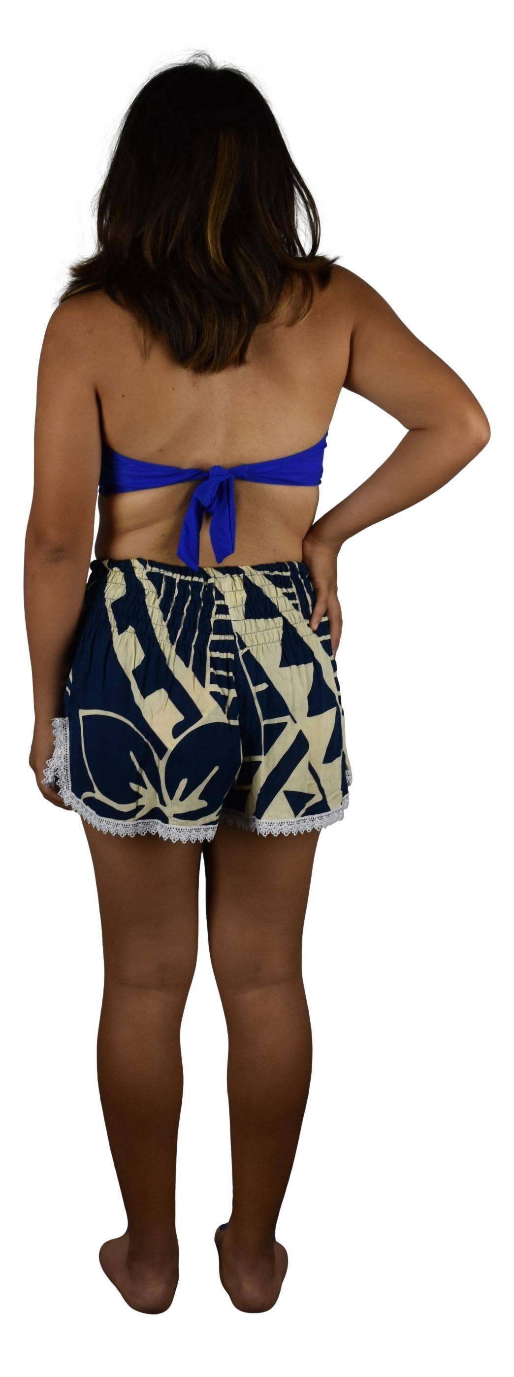 Beach Babes Hawaiian Hanu Turtle Lace Trim Shorts in Navy and Cream
