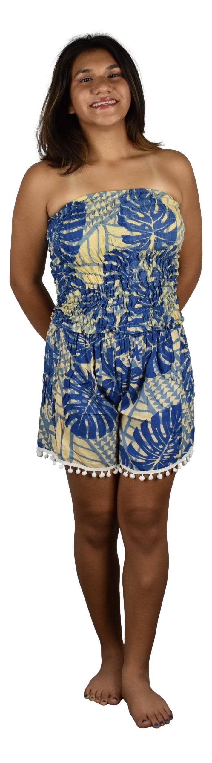 LAUHALA / MONSTERA - Classic Blue, Sunlight, Denim flowing tropical Shorts with Lace trim