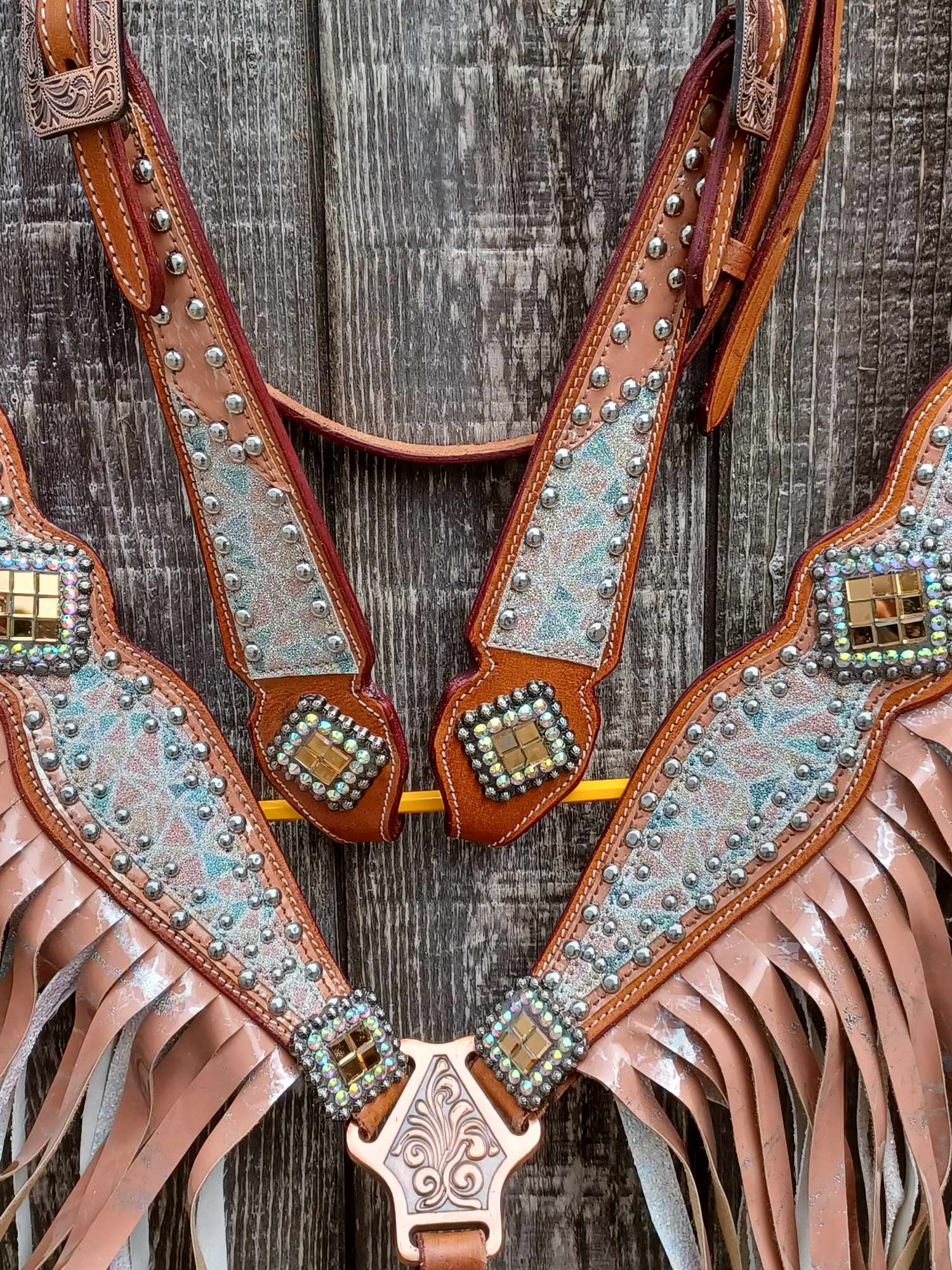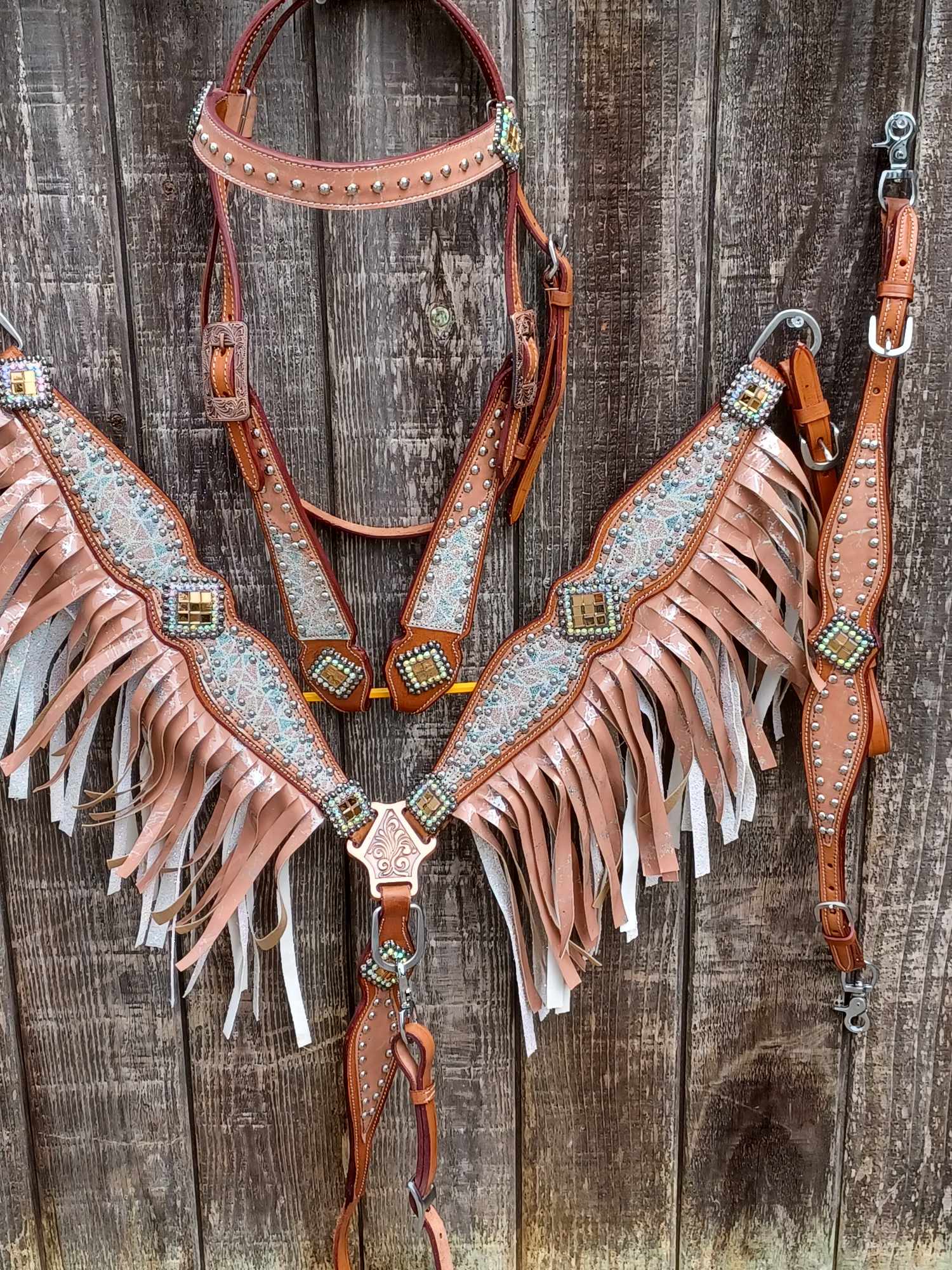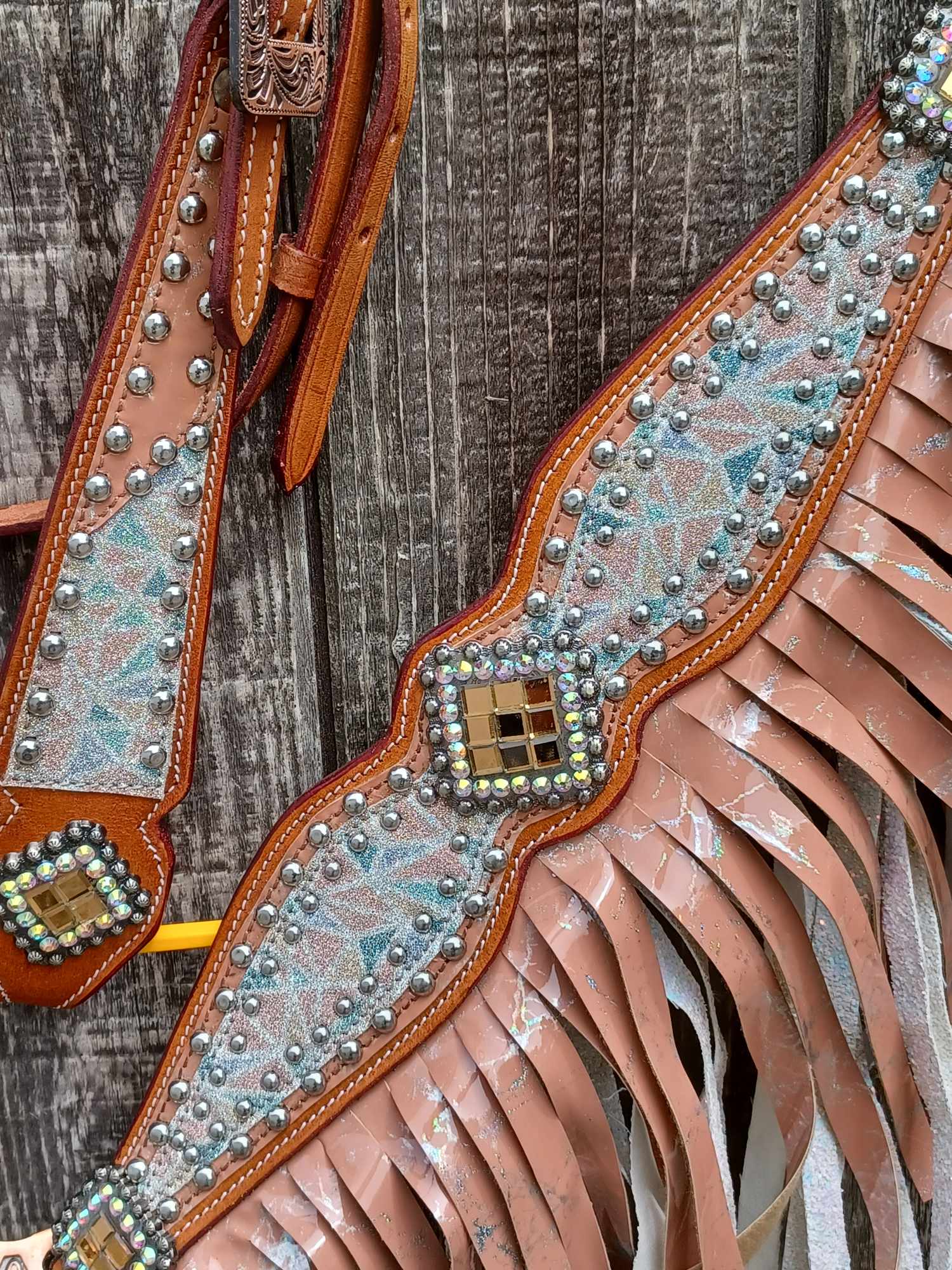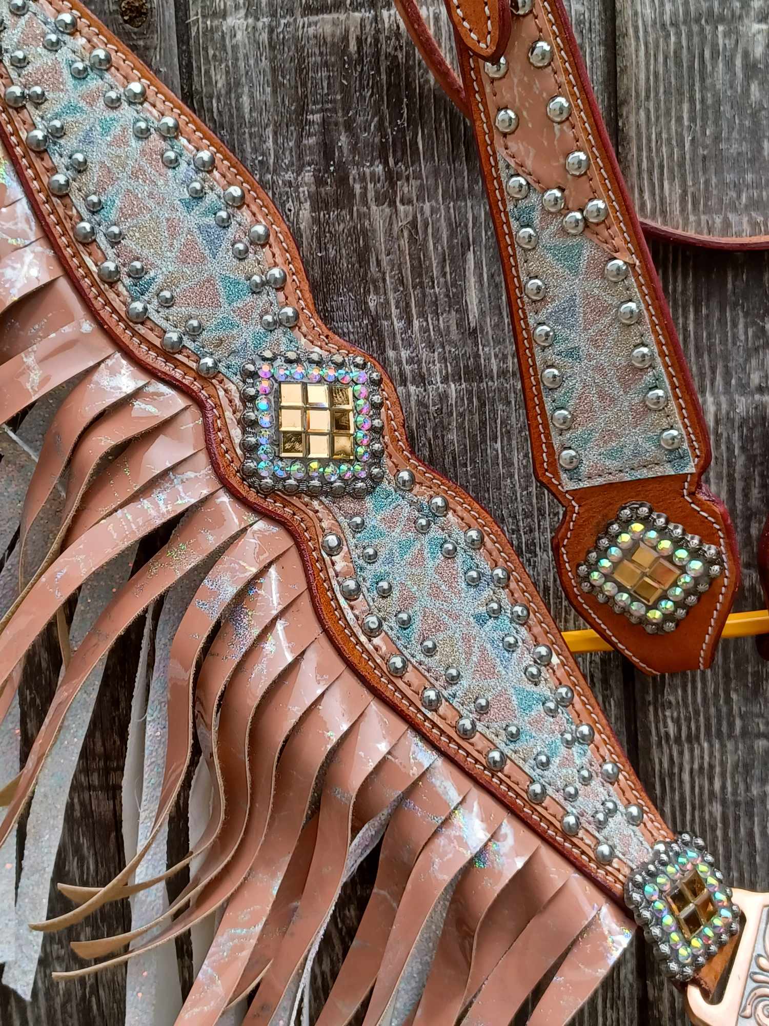 Peach and Teal Gorgeous Geometric Pattern, matched with AB Electric Crackle Design on Peach Leather and Double Fringe in the Electric Crackle and White Glitter