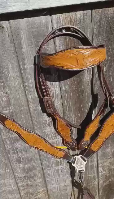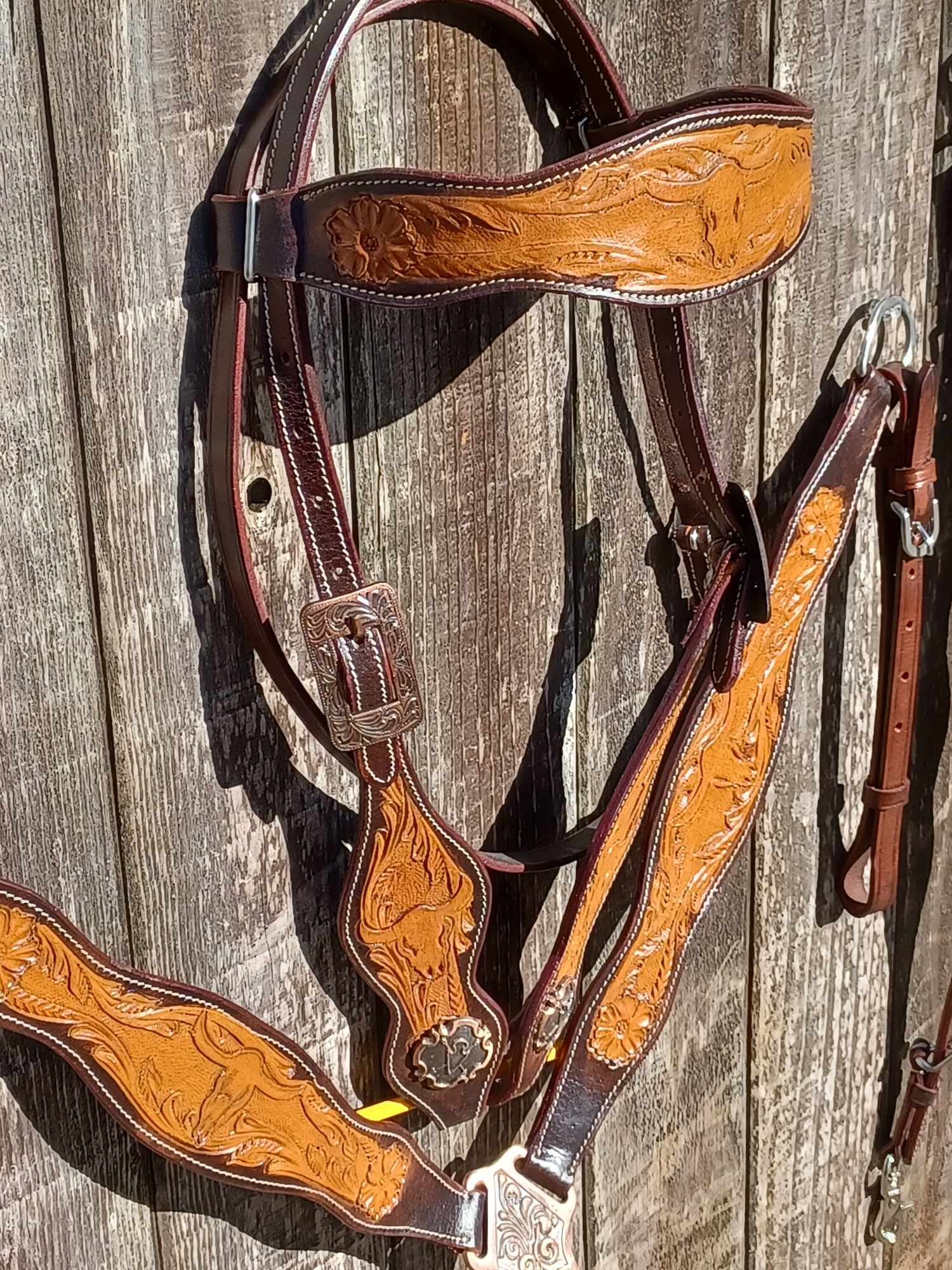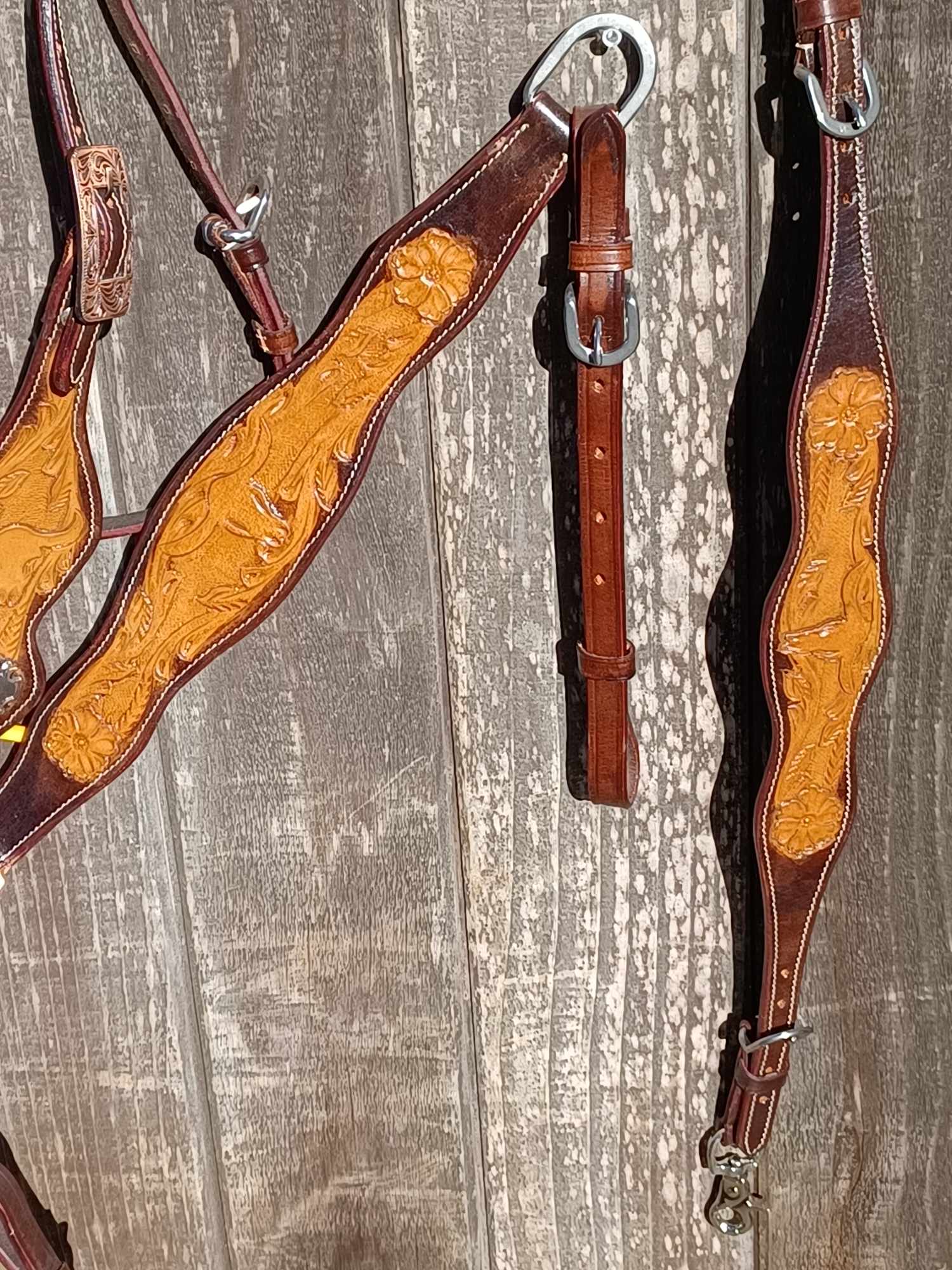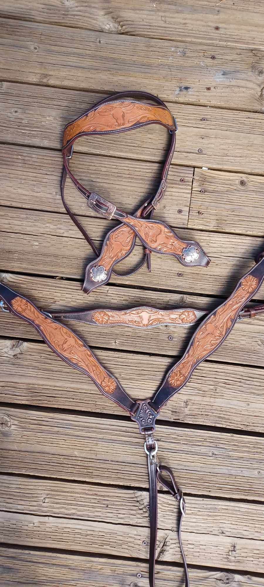 Beautifully Tooled Long Horn with Flowers Horse Bridle Set in Two Tone Leather with Matching Wither Strap