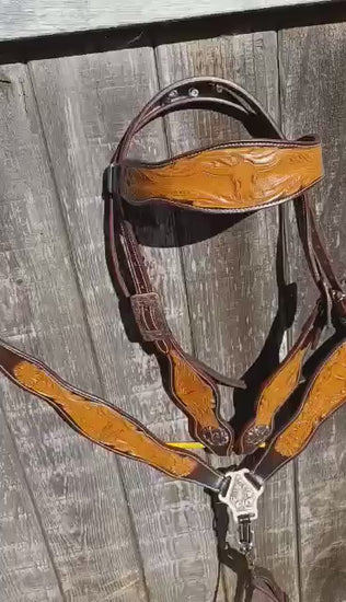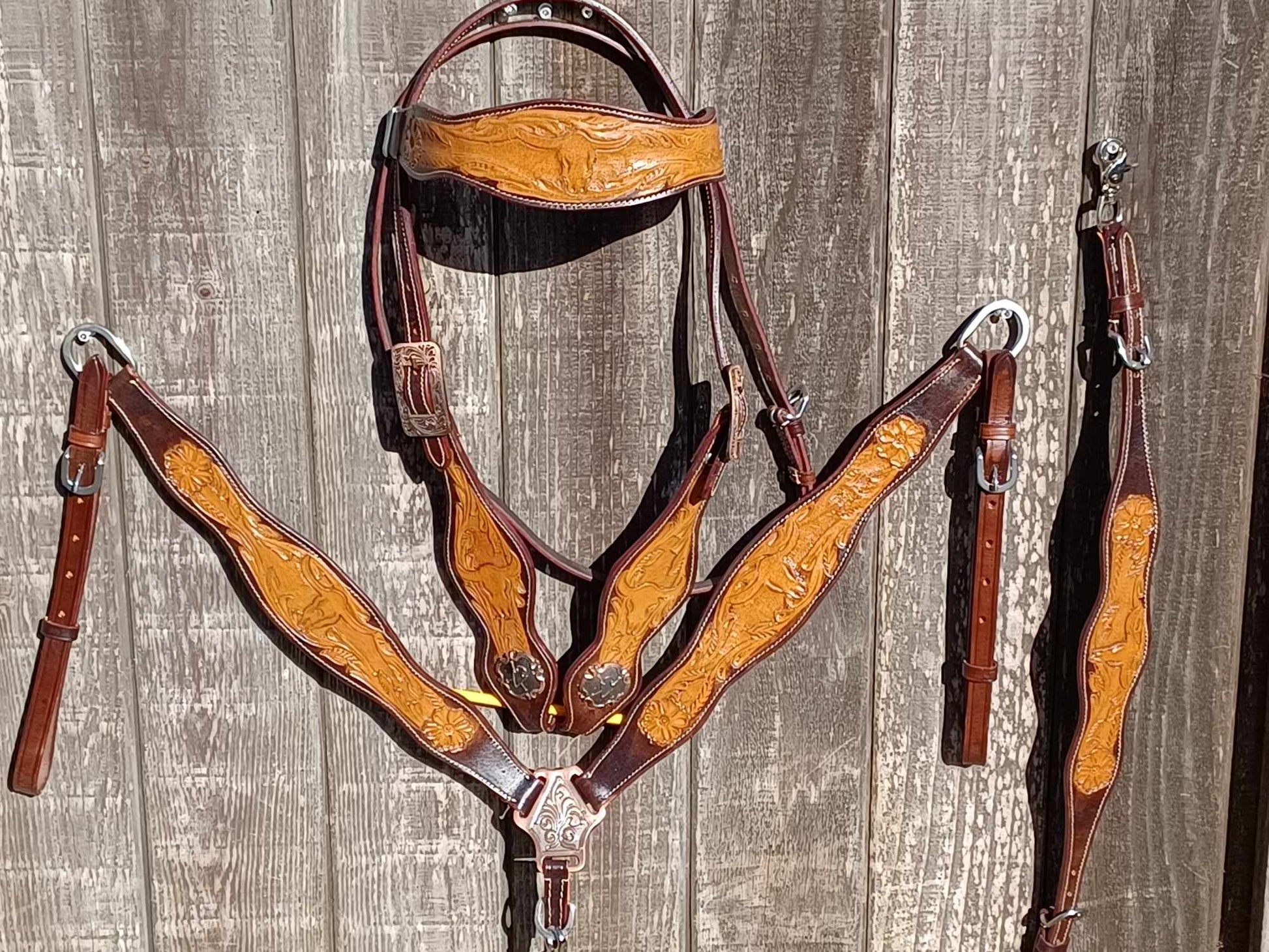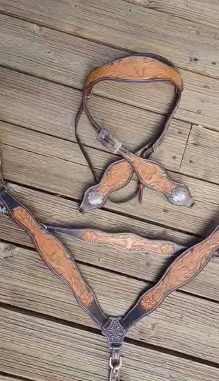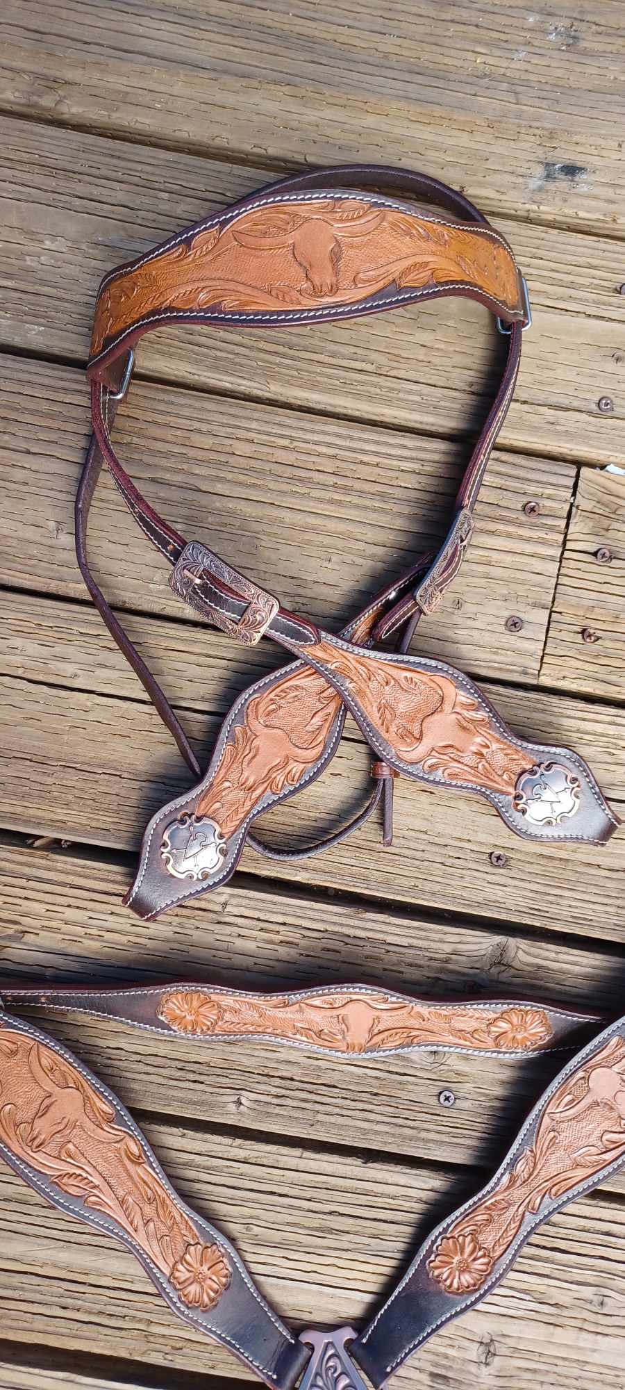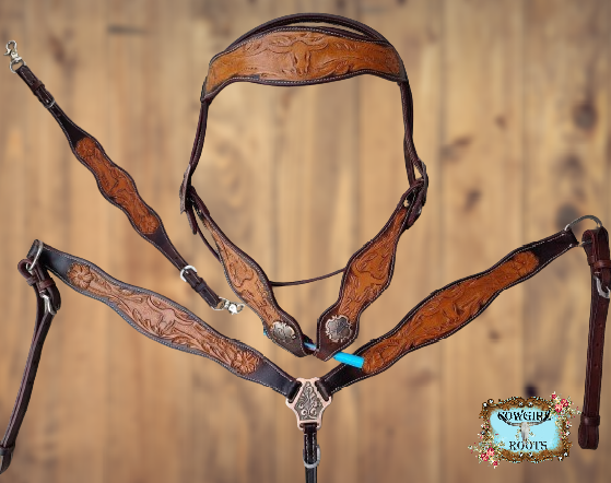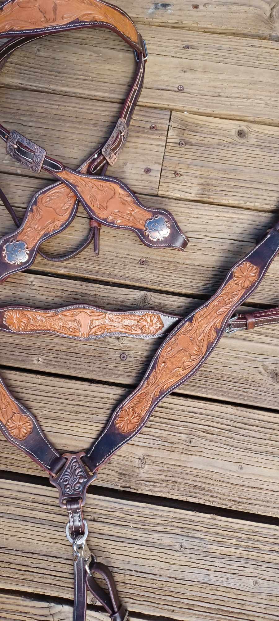 Beautifully Tooled Long Horn with Flowers Horse Bridle Set in Two Tone Leather with Matching Wither Strap