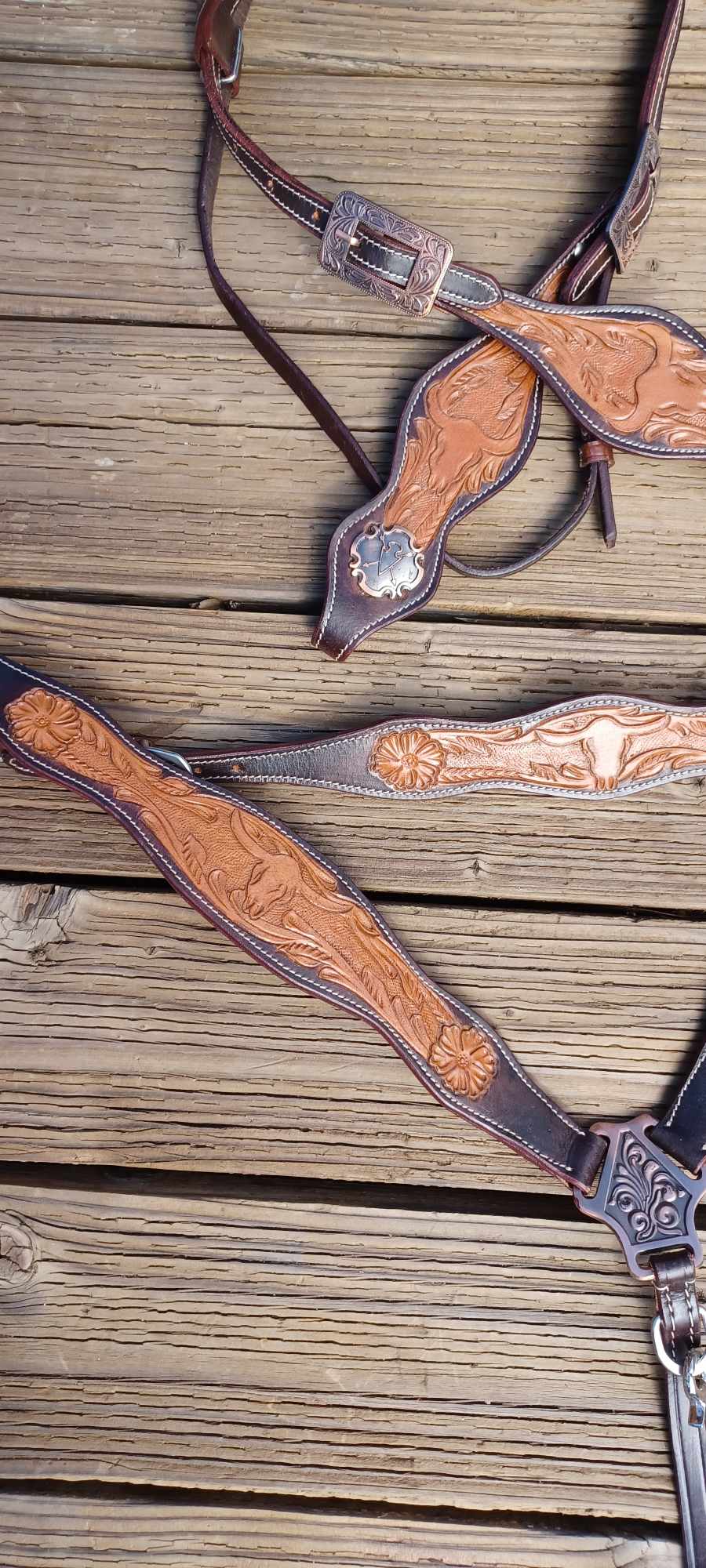 Longhorn and Flowers Tooled Horse Tack Bridle Set with Wither Strap