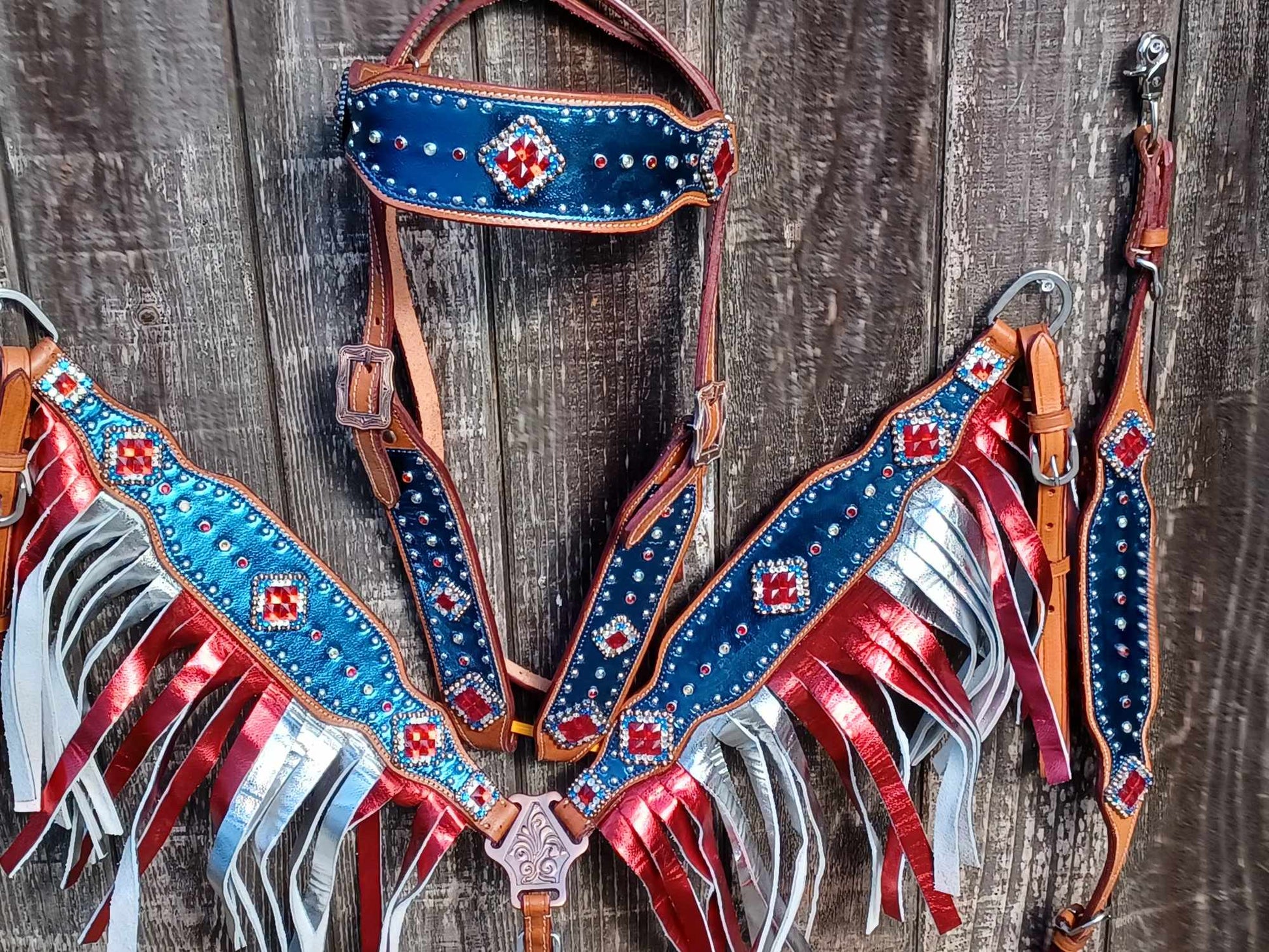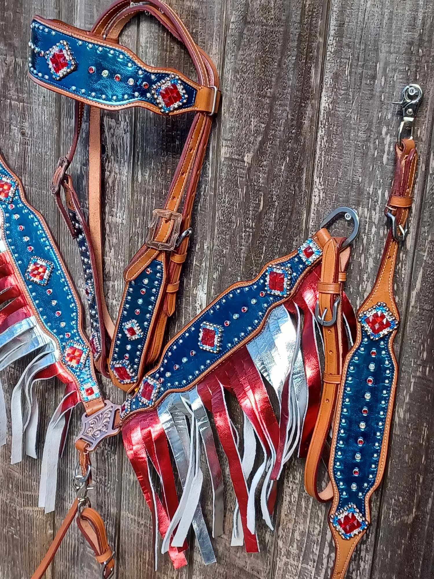 Gorgeous Patriotic Bridle Set! Genuine Leather Overlay and Fringe!
