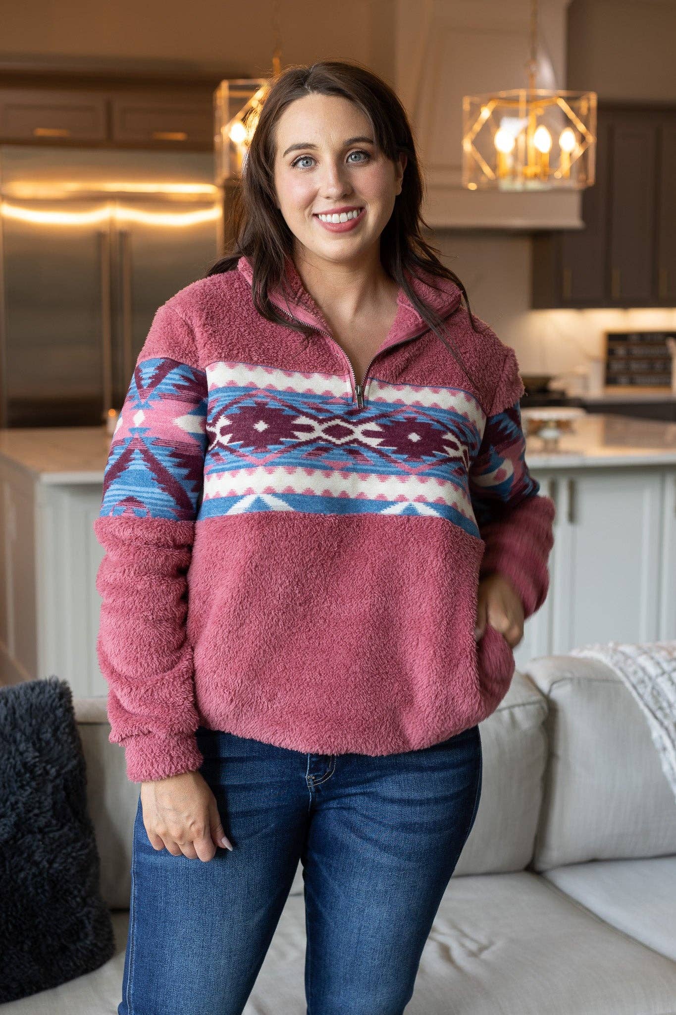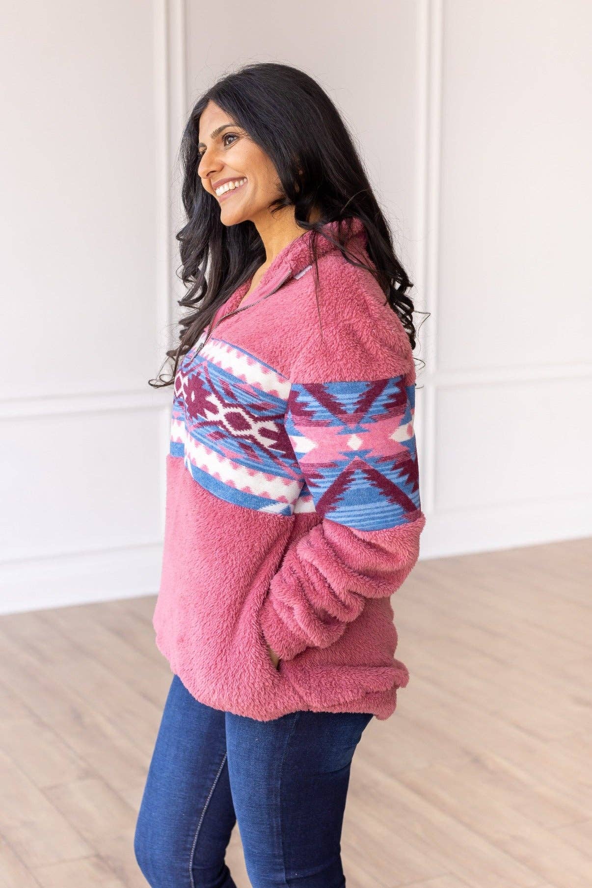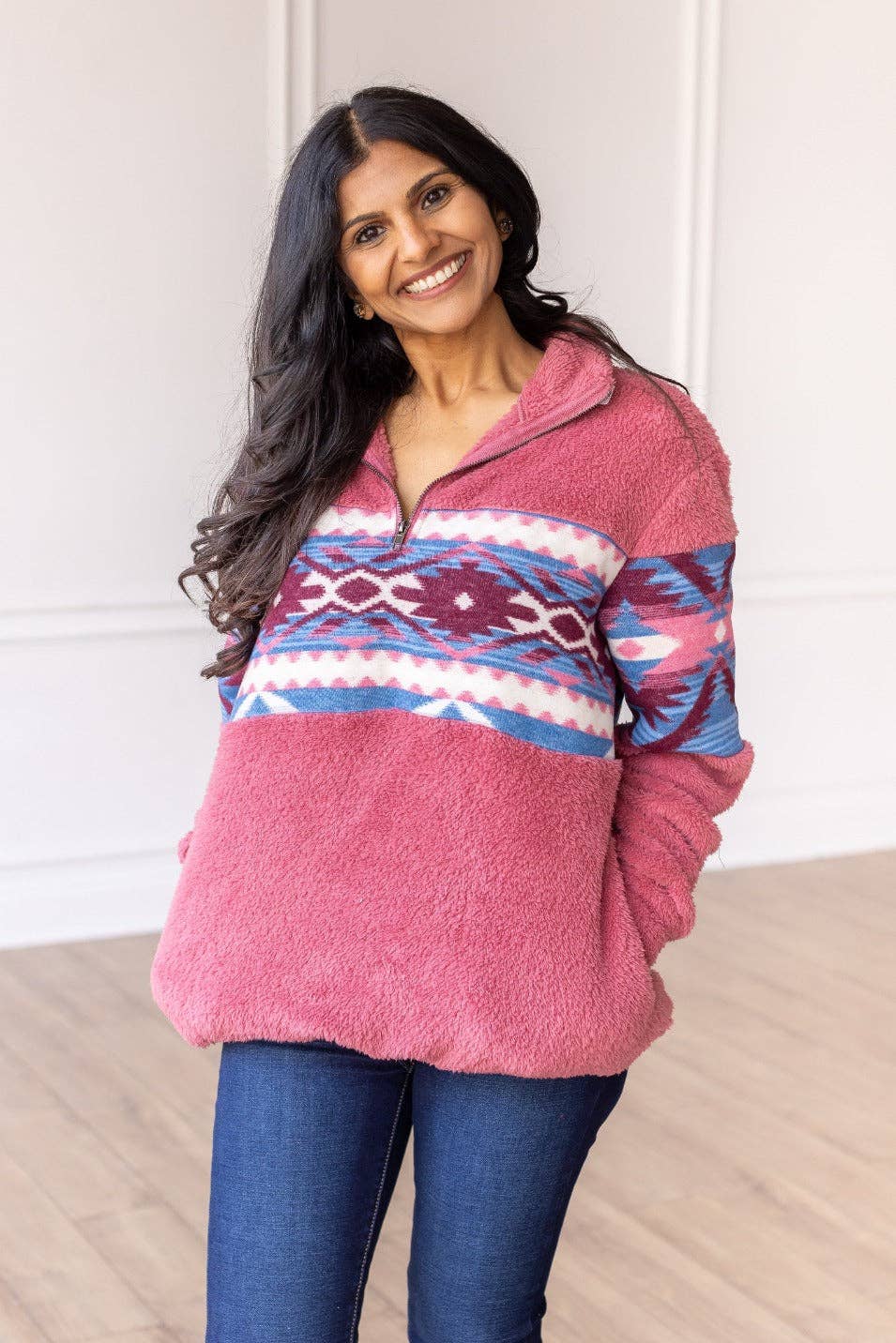 Trend Seeker Blush Pink Aztec Sherpa Half Zipper