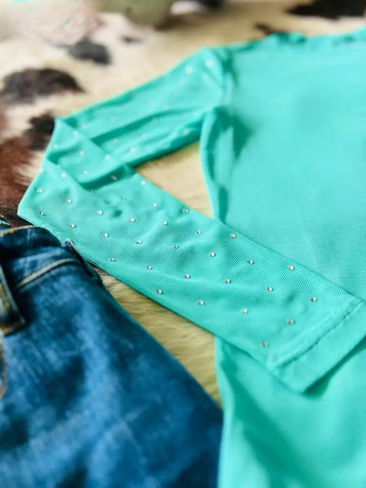 Make heads turn in our Turquoise Trouble Top! This fun and feminine piece features a turquoise long sleeve mesh top with rhinestones on the arms and neckline for that extra "wow" factor. So why wait? Pop it on, sparkle your way out the door and make your own turquoise trouble! 96% POLYESTER 4% SPANDEX