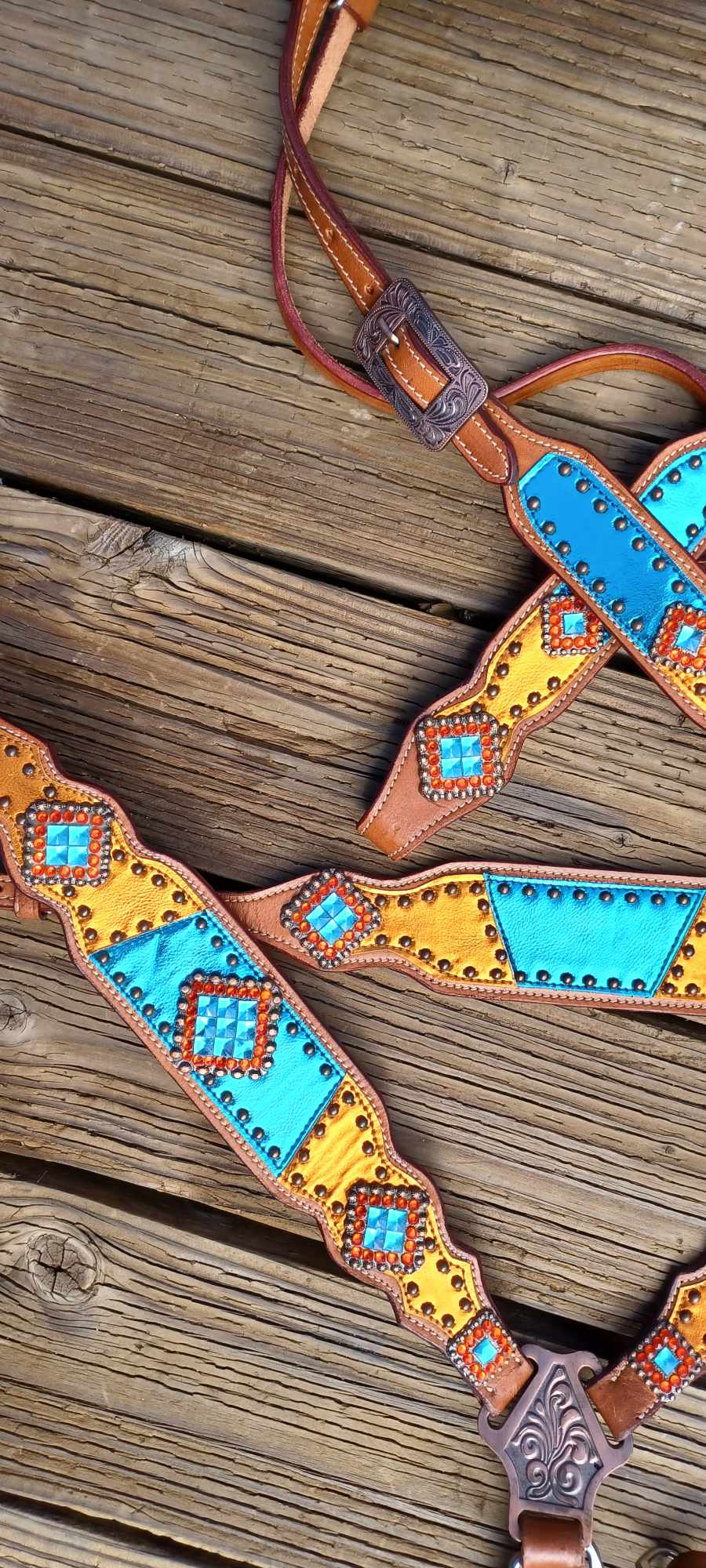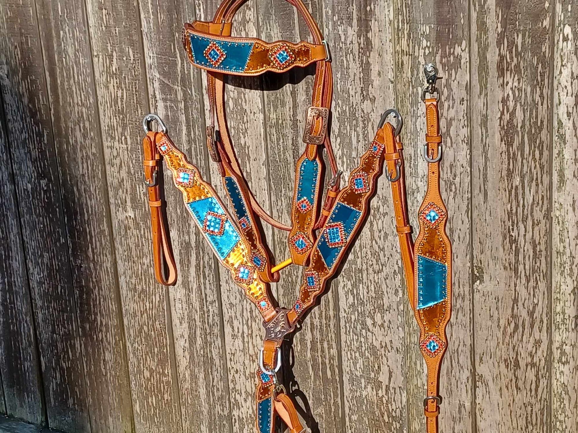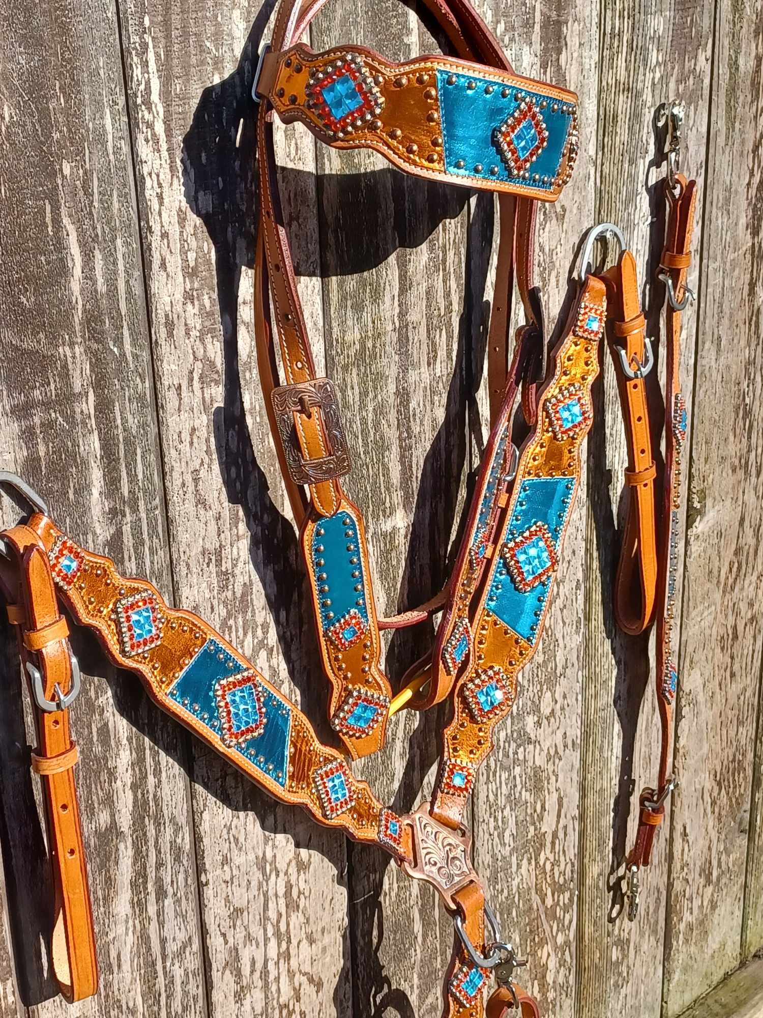 Teal and Orange Metallic Bling Horse Tack Bridle Set with Wither Strap