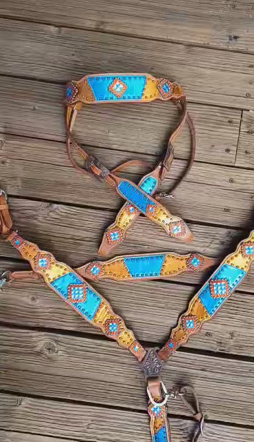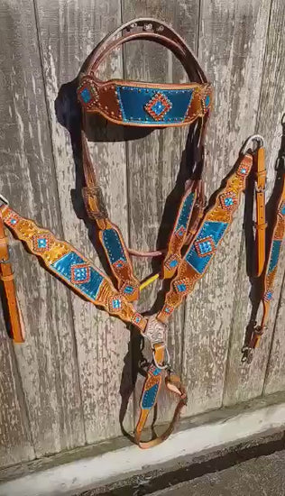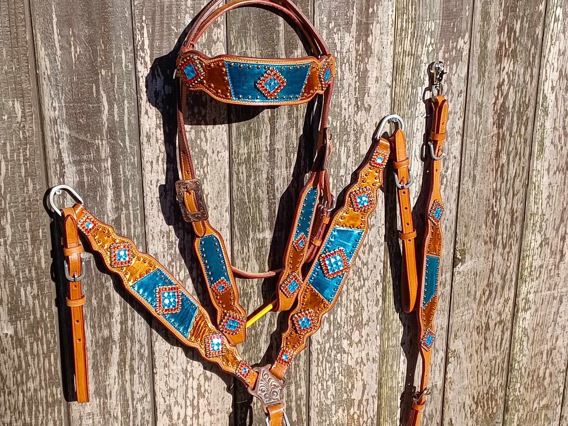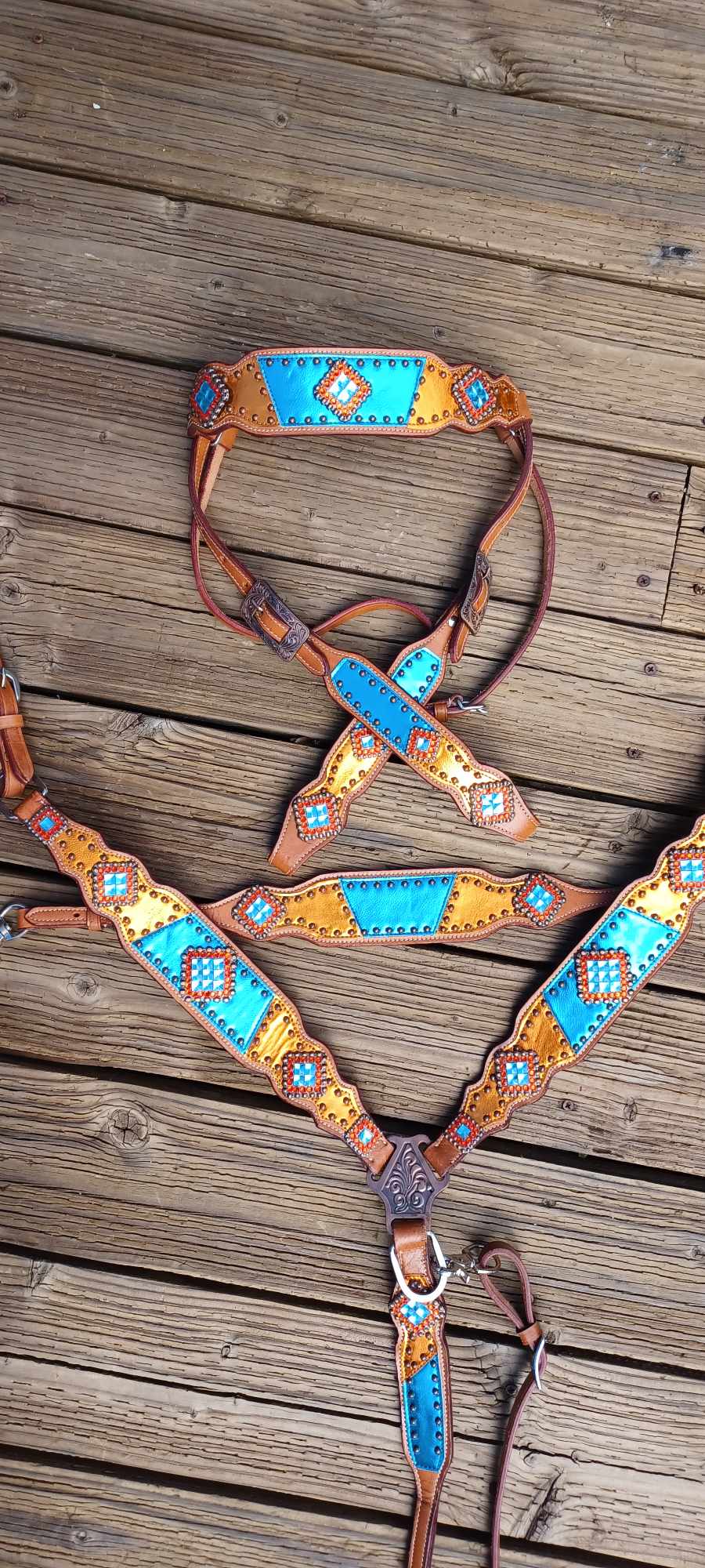 Teal and Orange Metallic Bling Horse Tack Bridle Set with Wither Strap