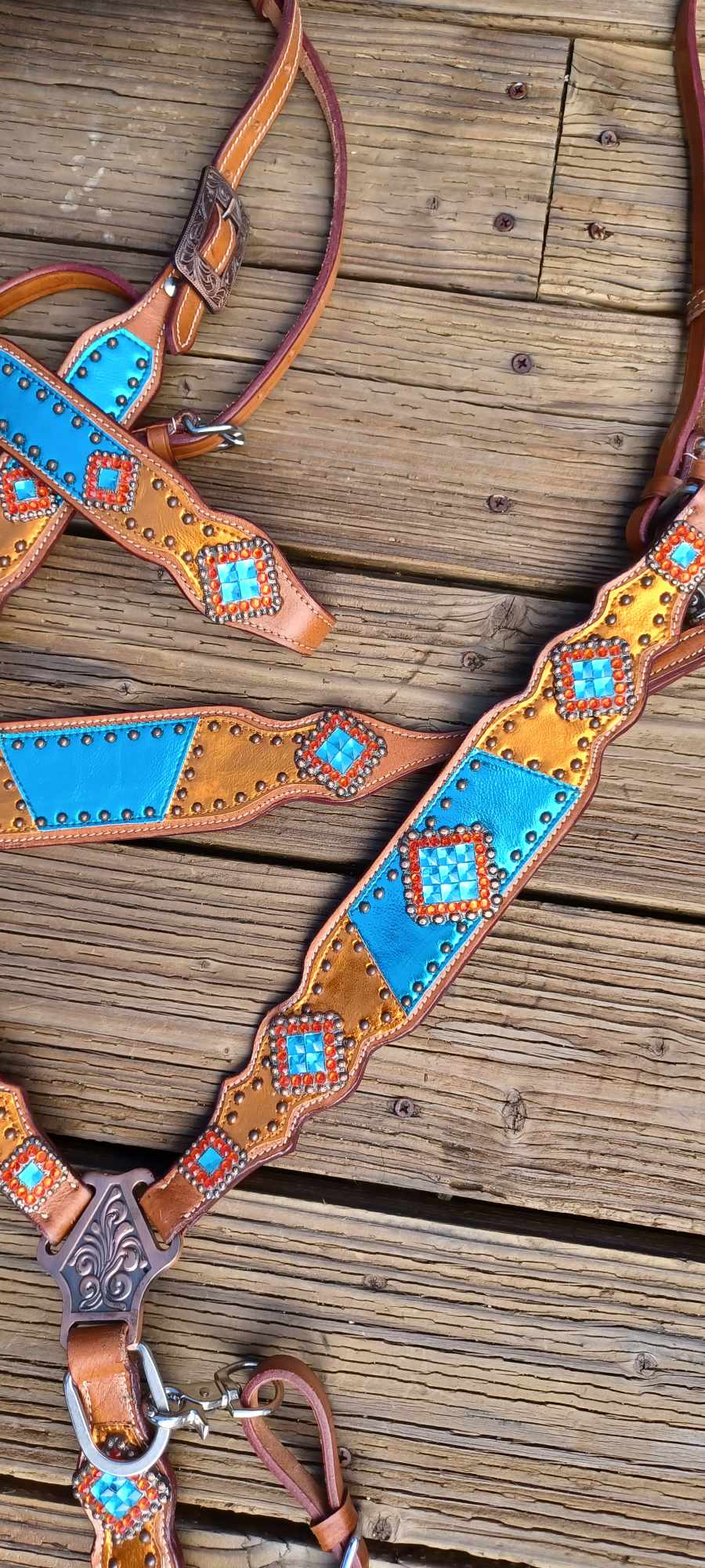 Teal and Orange Metallic Bridle Set with Crystal Bling Accents and Conchos, Includes Wither Strap