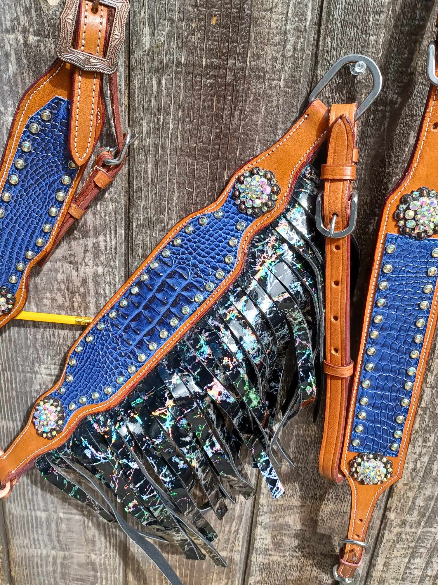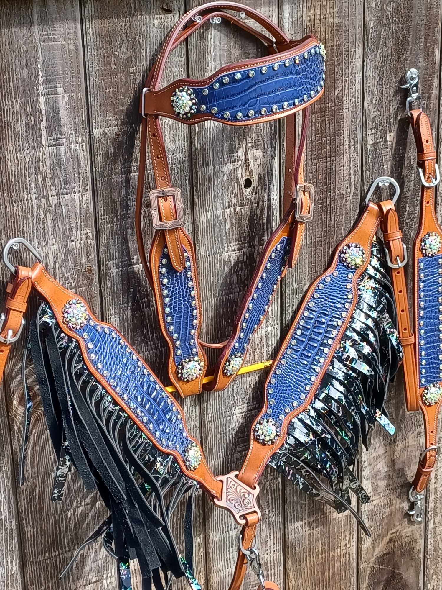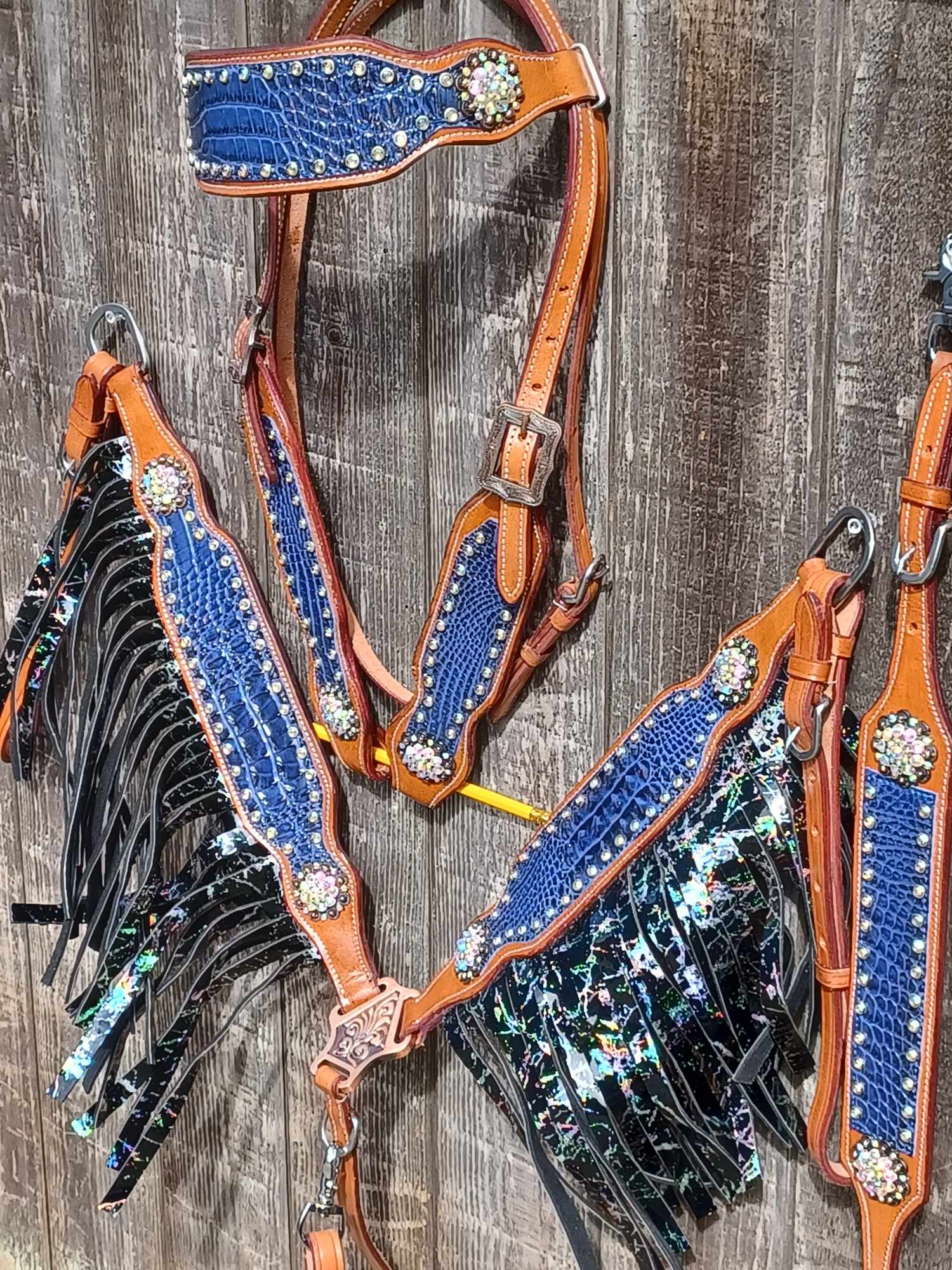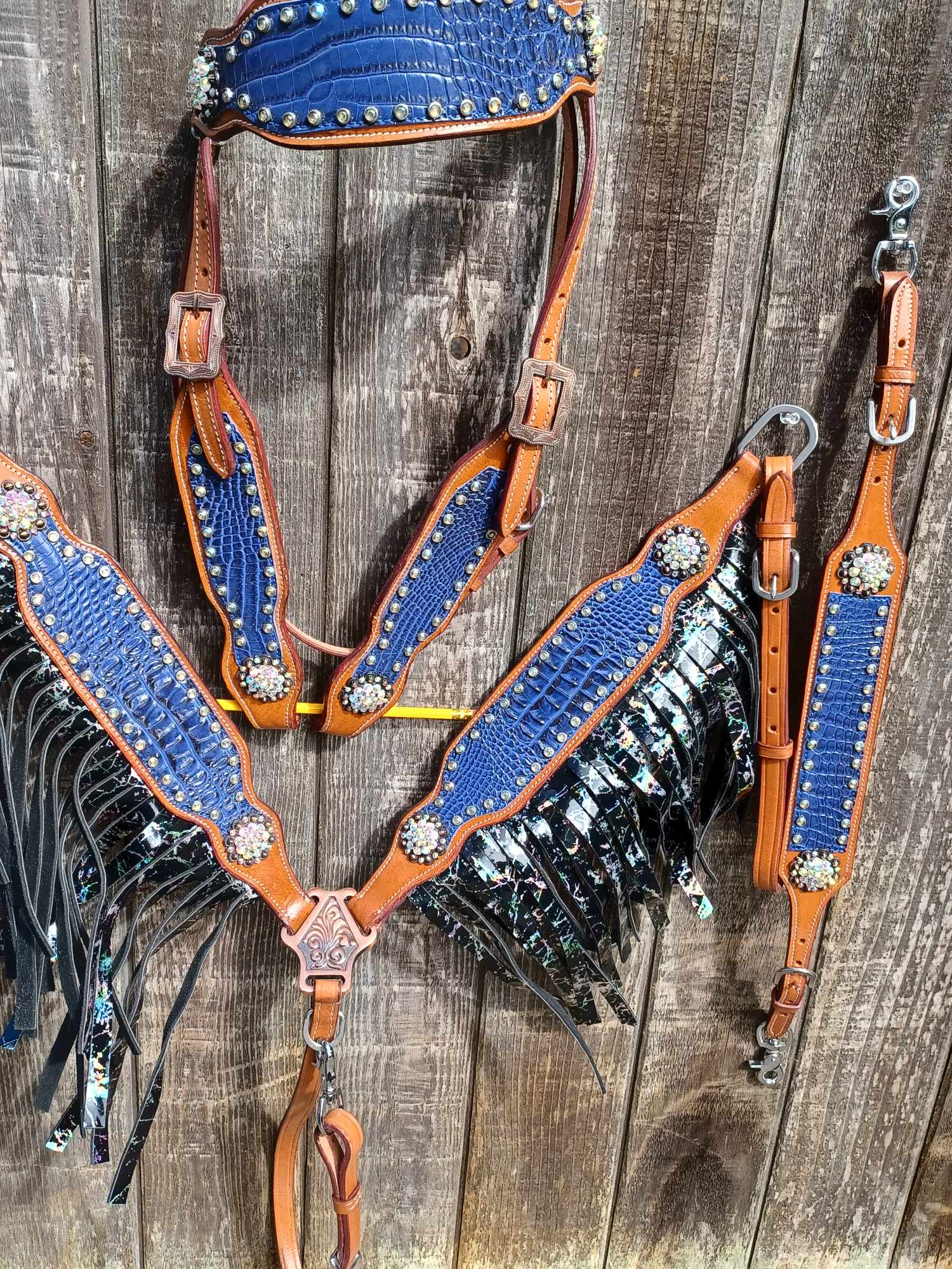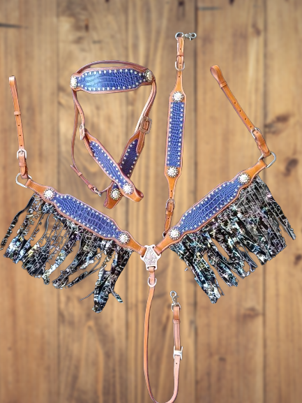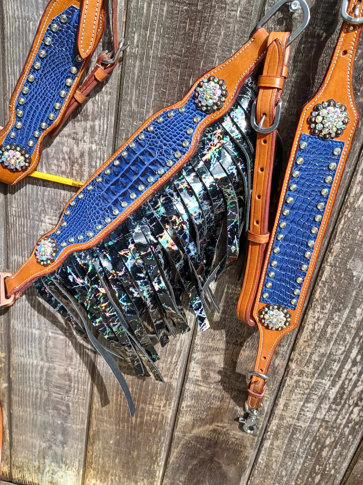 Electric Slide Purple Croc AB Crackle Fringe Headstall Breast Collar Set Wither Strap