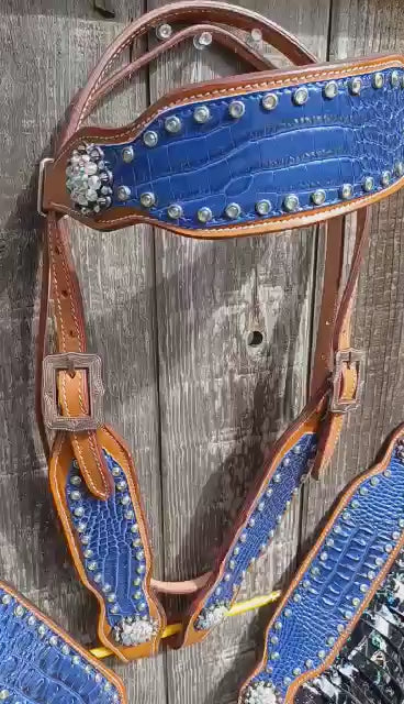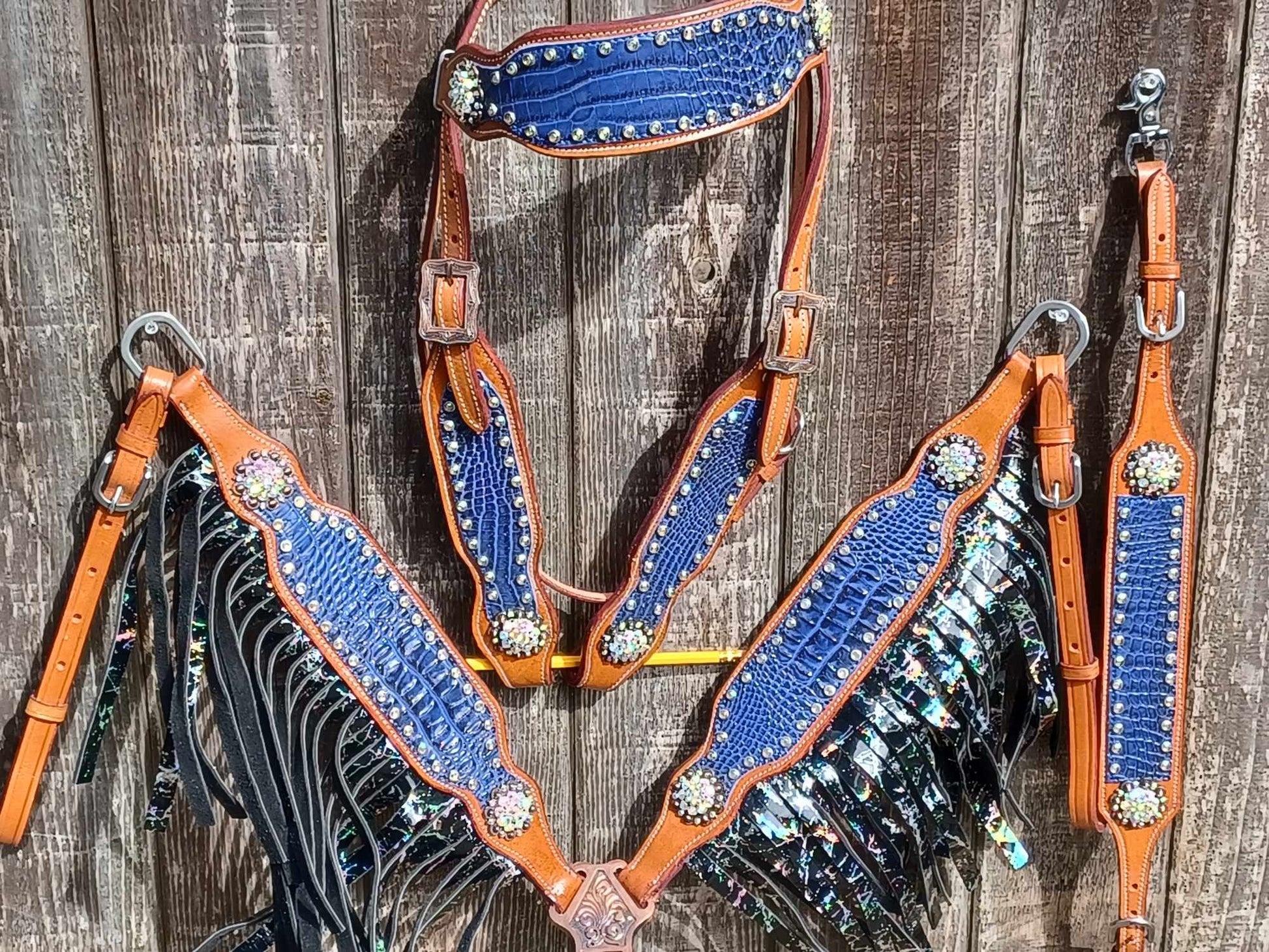 Stunning purple crocodile textured leather on medium leather with clear crystal bling Conchos and accents that will make you stand out from the crowd. Long black electric AB fringe adds extra flair to your look while you ride.